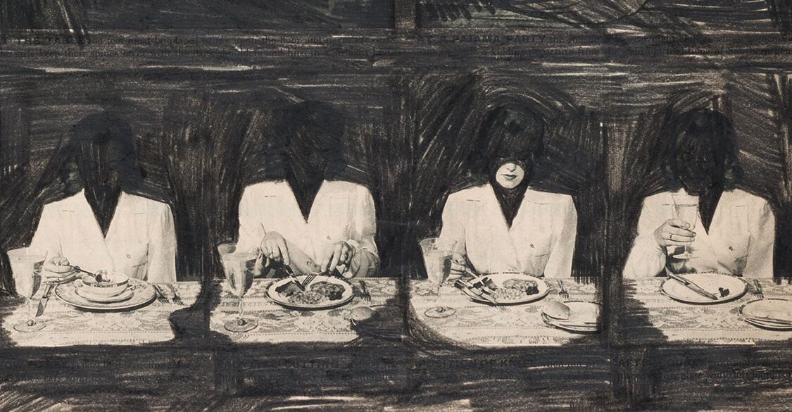 Guy uses old newspapers and books to make his artworks. He takes a lot of time to do his research. Guy regularly scrolls for half a day, looking for ideal pages. He structures and collects. The search for the right page is an instinctive activity. Sometimes Guy has seen a page over 100 times and then he suddenly knows it’s the page he was looking for. A certain sentence or image attracts his attention. Guy then uses the page as his canvas.