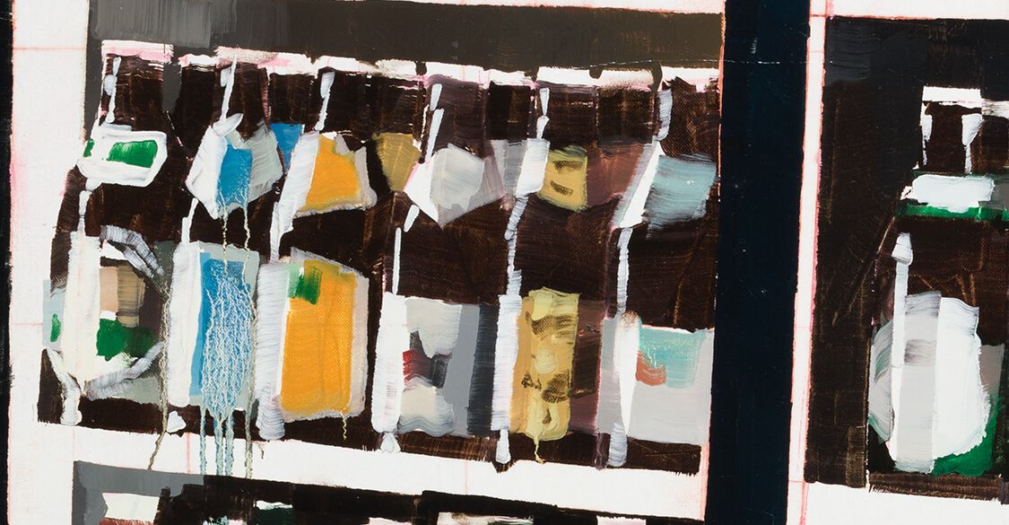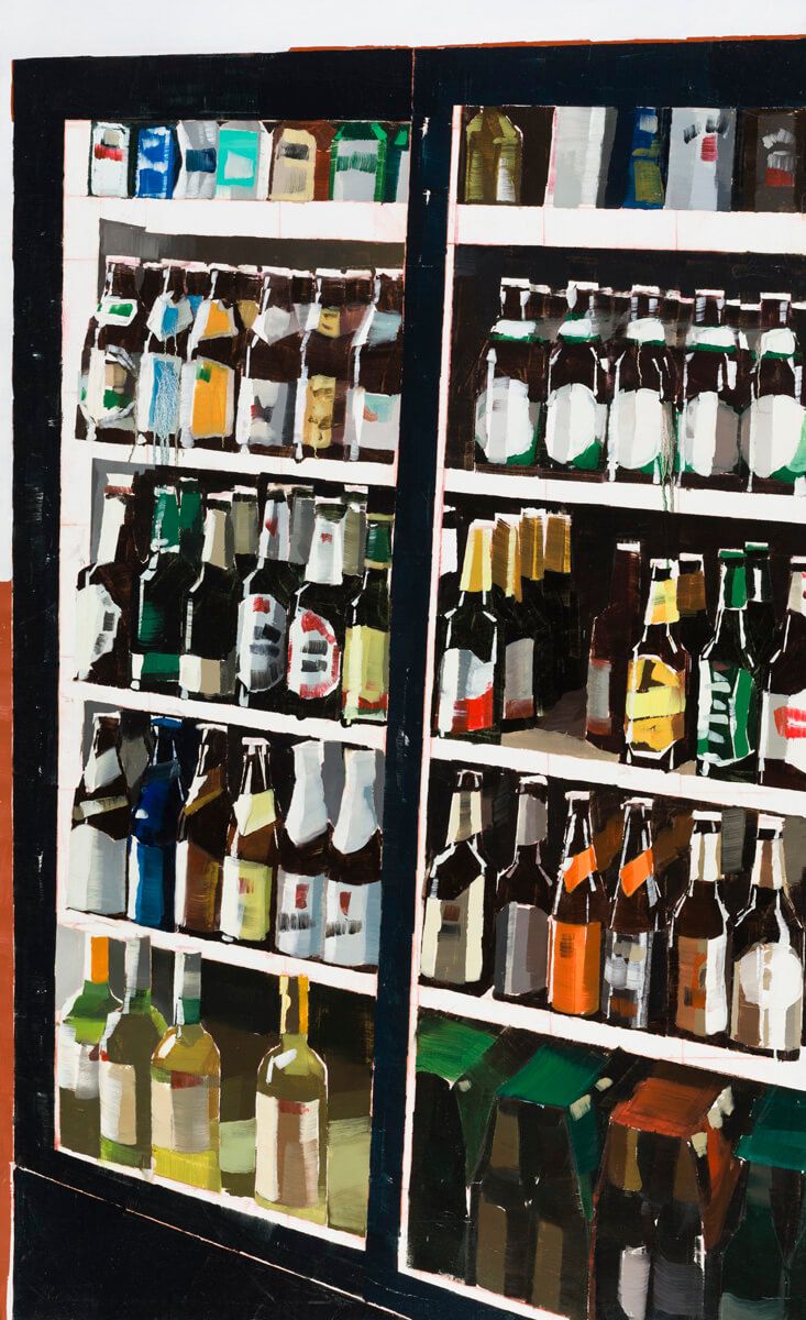 This painting is called Kuhlschrank. That means fridge in German. The artwork is part of a series about night shops in Germany. These stores are called Spätkauf. People can buy beer, cigarettes or other items here. A night shop is slightly more expensive than a regular supermarket. They can also be found in Dutch cities. Shop shelves and products are often the subjects of Luca.