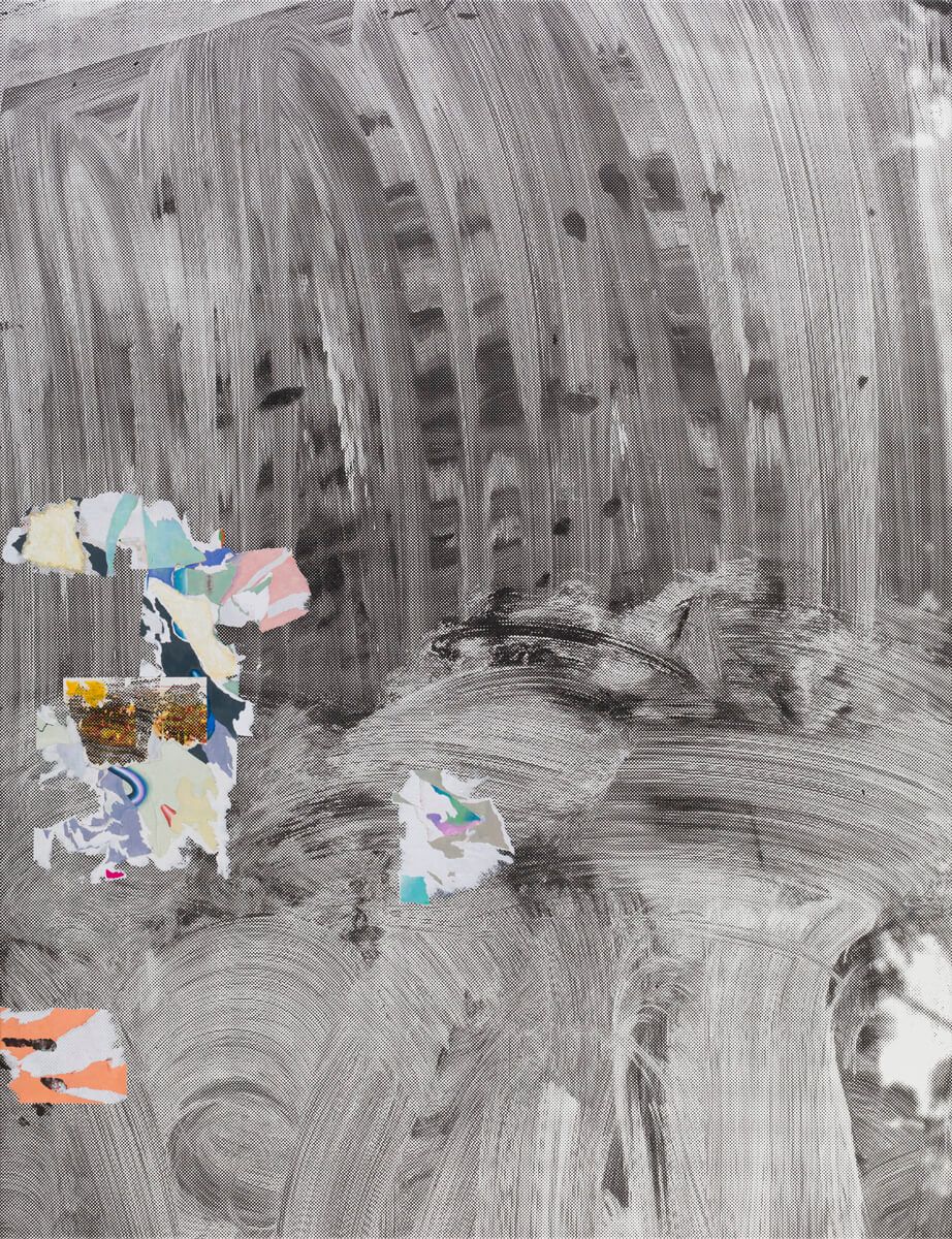 This painting is an arwork from a series that Paul created in 2014. In Scotland and North-England Paul saw shop windows painted in white. He photographed those windows. They were windows of closed shops. The different kinds of paper on the painting are the remains of torned up posters.