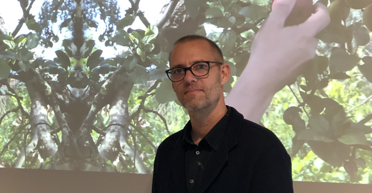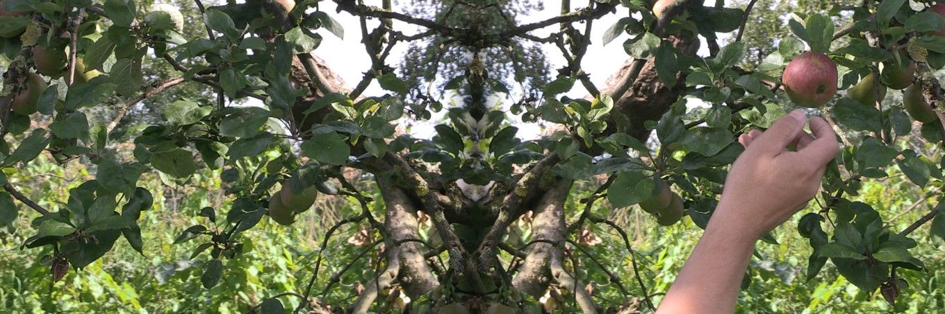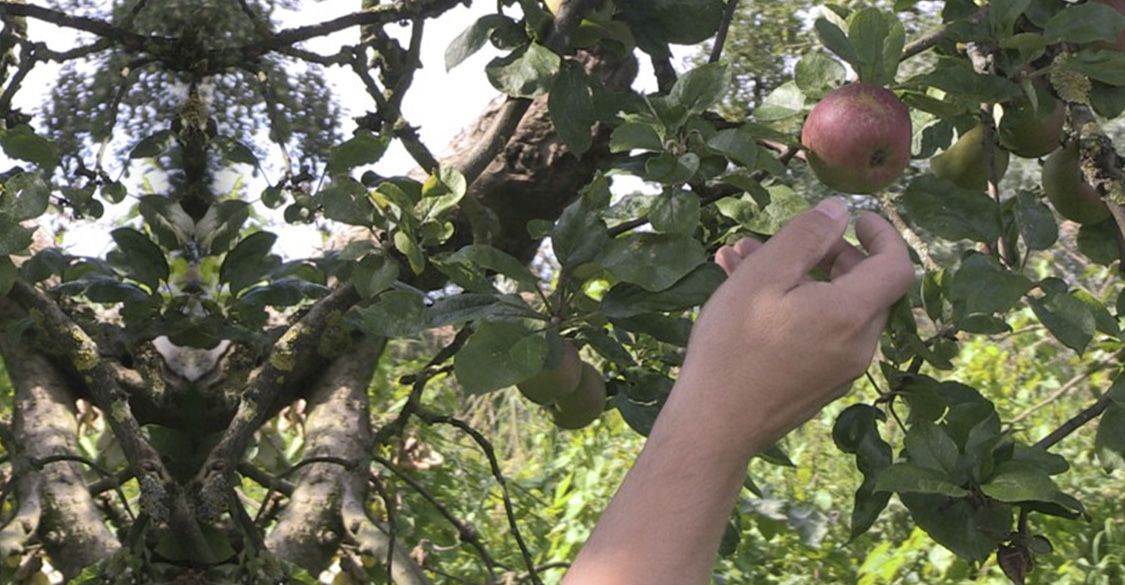 Sometims Caspar's wife helps him out when he makes his work. For this specific work the two of them went out to an apple orchard. They tried to film Caspar as he picked an apple from a tree. They could not find the perfect tree or the right angle and eventually gave up. On their drive home after a long day of trying they saw this tree through their car window. They decided to stop and take one last shot. Caspar’s wife set up the camera and this work was filmed.