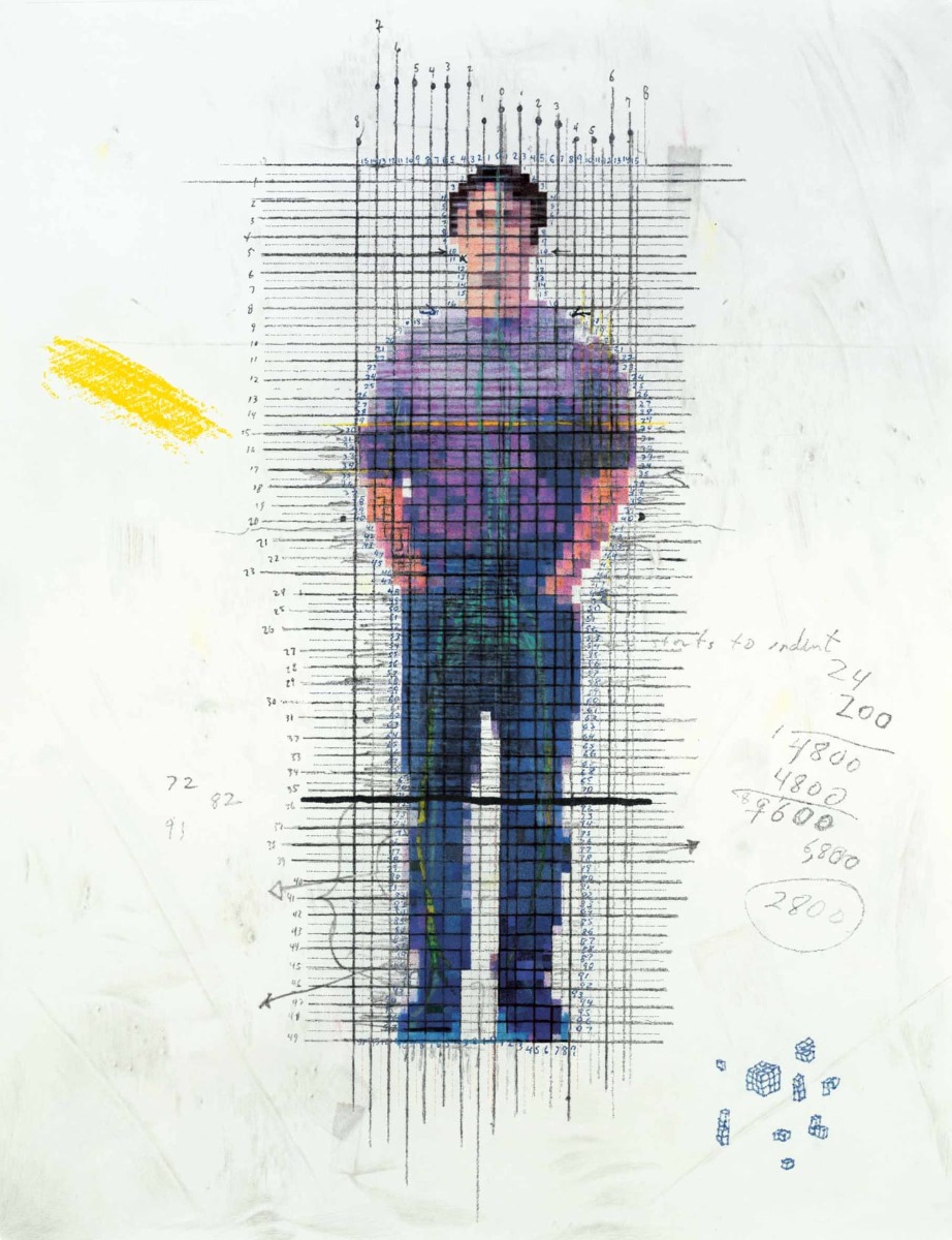 In de tekening hieronder zie je hoe kunstenaar Tom Friedman zijn portret op heeft gedeeld in vakjes.